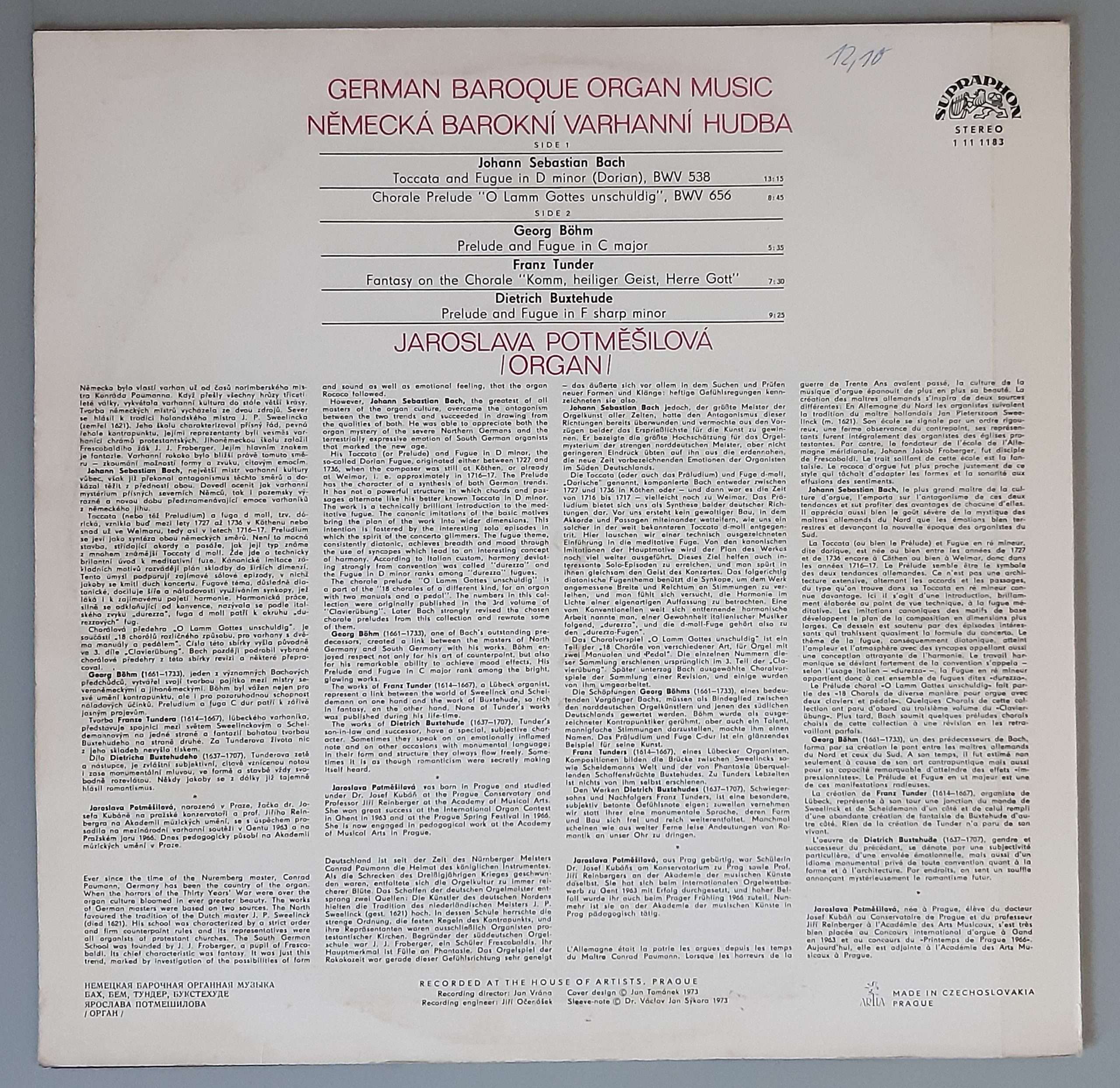 Jaroslava Potměšilová – „German Baroque Organ Music“ (Supraphon – 1 11 1183)